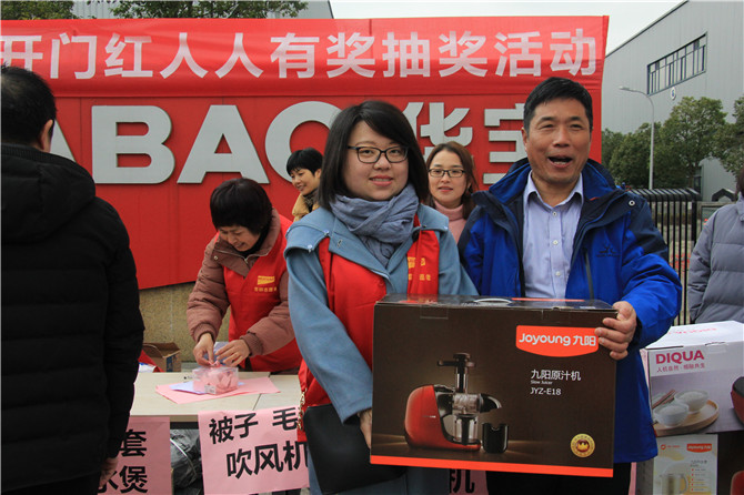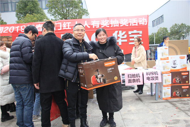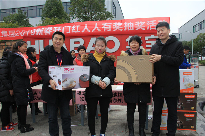 華寶公司為了迎接和感謝2018年的辛勤付出及時返崗的員工,在董事長胡仁寶先生的親自帶領(lǐng)下,公司為員工精心準備了豐厚的獎品:大到面條機、掃地機、電飯煲,小到被子、毛毯、背包、四件套、開水煲、電吹風、雨傘等等只要到場便人人有獎。