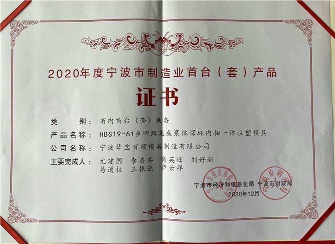 祝賀寧波華寶百順模具制造有限公司自主研發(fā)設計生產(chǎn)的HBS19-61多回路集成泵體深環(huán)內抽一體注塑模具。取得由寧波市經(jīng)濟和信息化局、寧波市財政局聯(lián)合頒發(fā)的“2020年度寧波市制造業(yè)首臺(套)產(chǎn)品”獎。